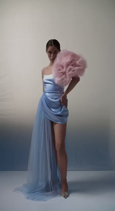 This strapless mini dress made of soft satin is suitable for any occasion. It features a round neckline that accentuates the shoulders and collarbones. The fabric drapes beautifully, creating a feminine silhouette. Complete the look with our detachable accessories and strappy high heels for a stylish outfit.