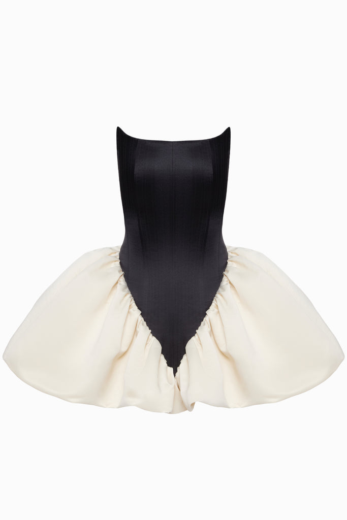 Angled Transformer dress in black redefines versatility with its transformative design, allowing you to switch between different looks effortlessly. Featuring a corset-style bodice that enhances the waist and neckline, it provides both structure and comfort. The voluminous skirt can be adjusted to create varying silhouettes, making it perfect for any occasion.