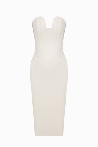 This elegant pink midi dress is crafted from a smooth, matte fabric that hugs the body, creating a sleek and flattering silhouette. The structured design with vertical seam details enhances the figure, while the strapless neckline adds a modern, chic touch. The full-length cut makes it perfect for formal events, while the minimalist style ensures it can be paired with a variety of accessories for different looks.