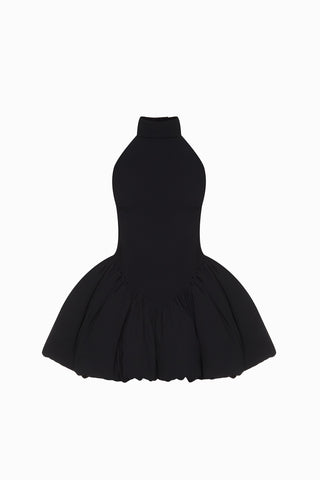 The only gown in the collection with a high neckline. A voluminous balloon skirt adds a touch of playfulness, while the structured bodice provides a striking contrast of modesty and charm.