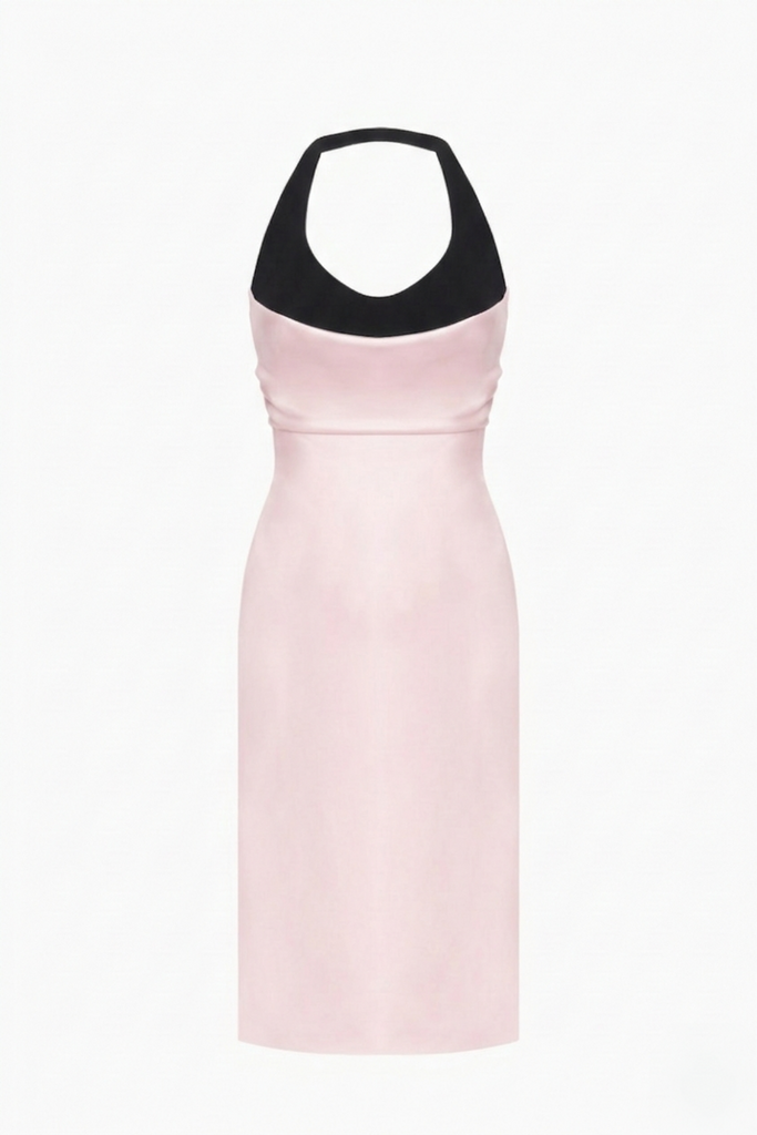 June maxi dress in pink combines modern sophistication with a touch of femininity. The soft pink satin fabric drapes beautifully, hugging the silhouette while flowing gracefully down to the floor. The black halter neckline adds a striking contrast, creating a chic, minimalist look. This dress is perfect for formal occasions, offering both classic and bold style.