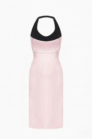 June midi dress in white offers a sleek, modern silhouette with a sophisticated halter neckline in contrasting black. The soft, satin-like fabric drapes elegantly over the body, creating a flattering and form-fitting shape. The midi length enhances its understated elegance, making it a versatile choice for both formal and semi-formal events.