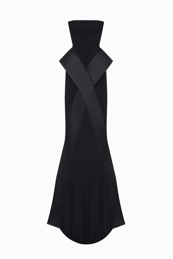Nora mini dress in black is an elegant piece featuring a strapless design with a structured, corset-style bodice that shapes the figure. The dress is accented with architectural satin folds that wrap around the waist, creating a unique and eye-catching silhouette. The contrast between the matte fabric of the bodice and the lustrous satin adds depth to the dress, making it perfect for both formal and evening occasions.