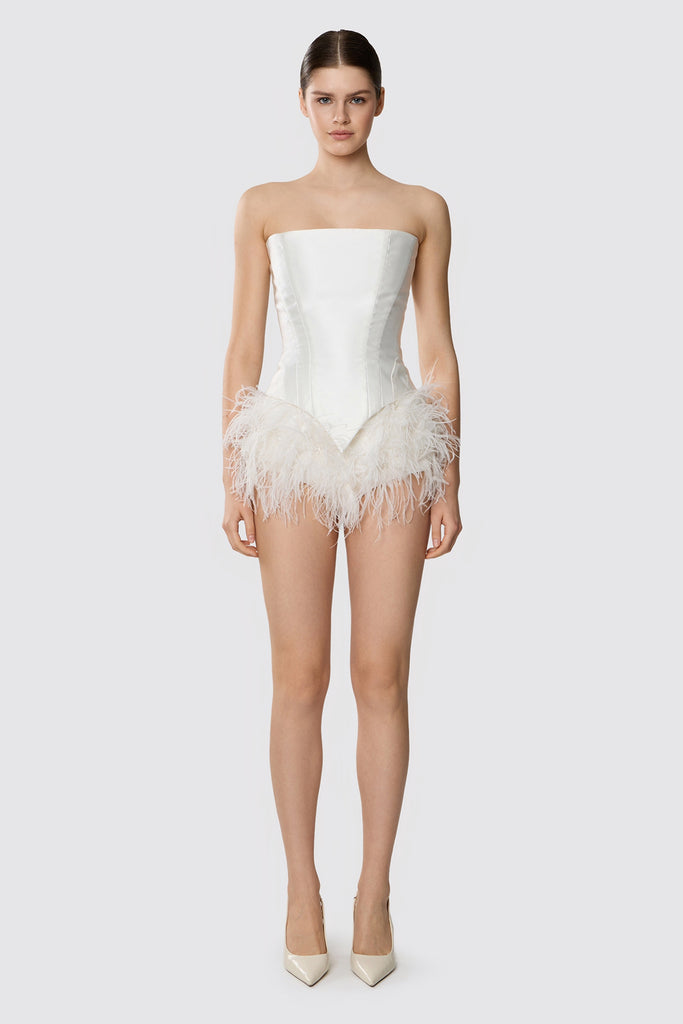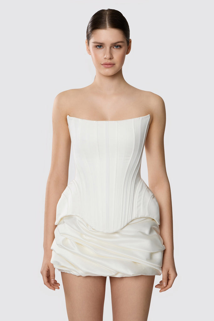 This satin corset features a striking angled hem that adds a modern, architectural touch to the silhouette. Its strapless design emphasizes the shoulders and neckline, creating a refined and elegant look. The corset is crafted from smooth, lustrous satin, combining structure and sophistication to perfectly complement voluminous skirts or layered tulle gowns.
