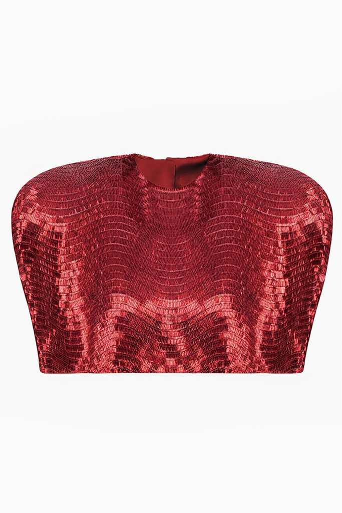 A lightweight sequin bustier top with a modern cut. The fitted design highlights the figure, while the shimmering fabric adds a festive and original touch. Perfect to pair with skirts, trousers, or shorts, creating a stylish and versatile outfit for special occasions.