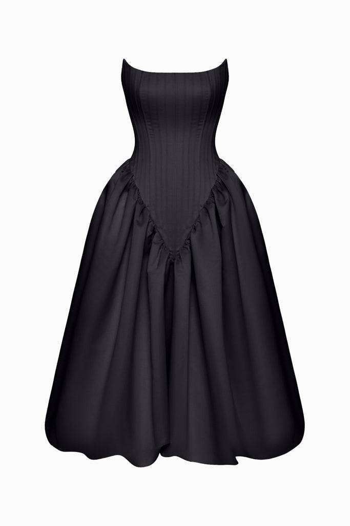 Thea dress in black features a delicate lace corset top with structured seams, offering a sophisticated, vintage-inspired look. The bodice is complemented by a voluminous skirt that gently puffs out, creating a flattering and feminine silhouette. The contrast between the sheer lace and the matte finish fabric adds depth and texture, making this dress an elegant choice for evening events or special occasions.