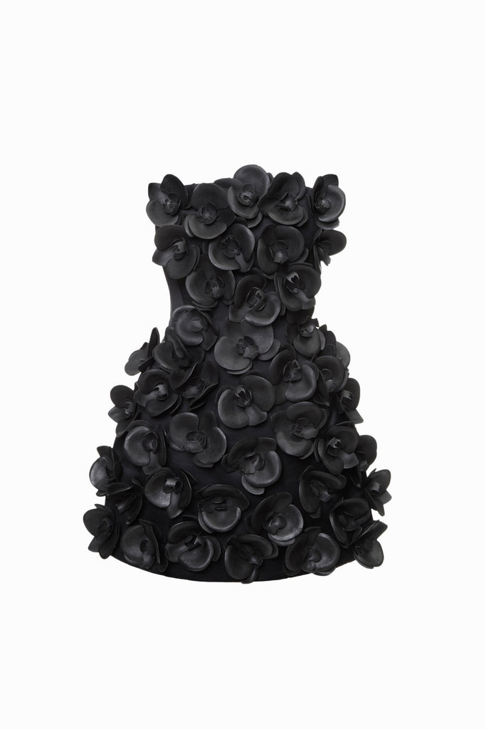 Чорна сукня міні з акцентом на об’ємний декор. Вся поверхня оздоблена об’ємними квітами з ніжними стразами, що створюють ефект фактурності та легкого сяйва. Прямий силует робить модель зручною, а декоративні деталі додають їй виразності та оригінальності.