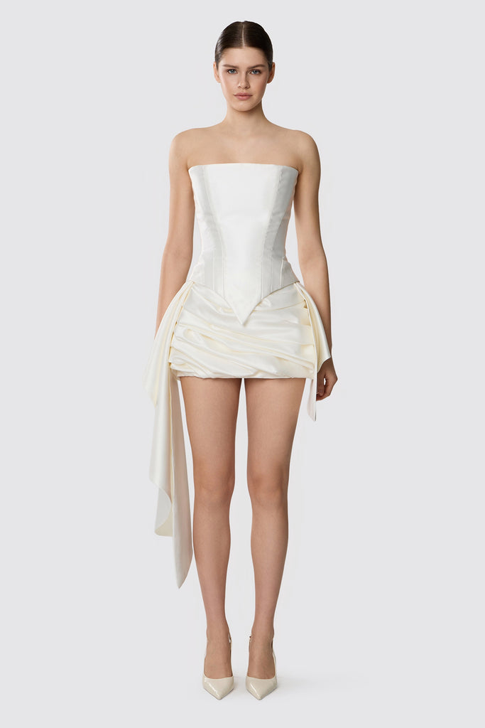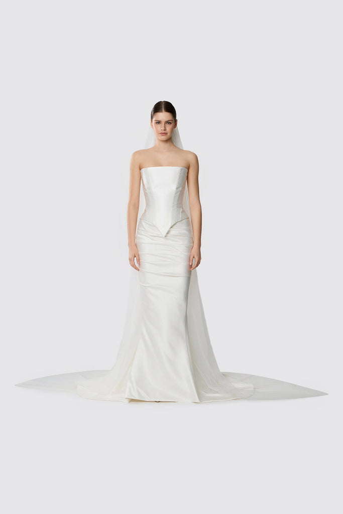 The skirt captivates with its unique design and texture. The voluminous pleats create depth and movement, beautifully highlighting the figure. Pair it with the Irma corset and a specially crafted trail for a stunning, one-of-a-kind bridal look.